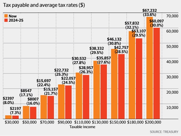 - both voted for the plan despite saying they disagree with the third stage which delivers a tax cut of $7,225 a year for a person on $200,000 from 2024-25 while someone on $30,000 would get a tax cut of $200 a year.