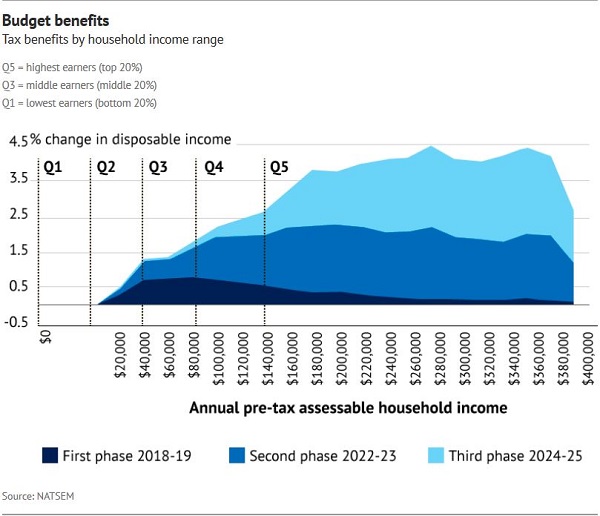 The Coalition has billed the cuts as supporting ‘middle Australia’, meaning those earning $80,000 plus. Jacob Greber in Tax cuts are awful for middle Australia. To pretend otherwise is misleading points out that median earnings are only $52,988, or $46,800 if you are a woman: