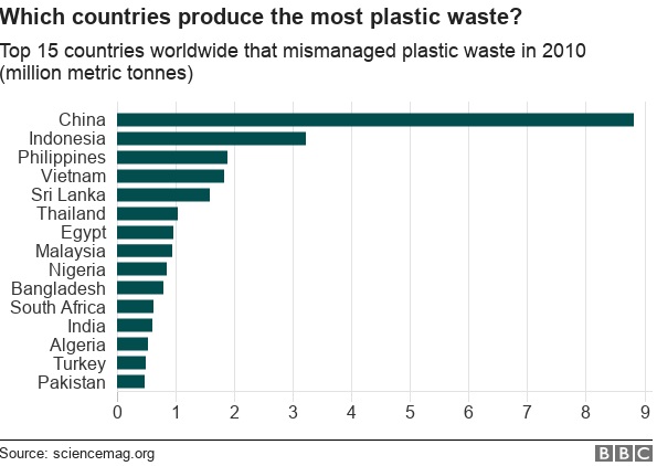 From the BBC, the 15 countries producing the most plastic waste in 2010: