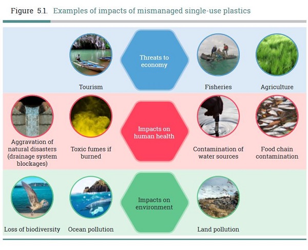 From the UN report, examples of impacts of mismanaged single-use plastics: