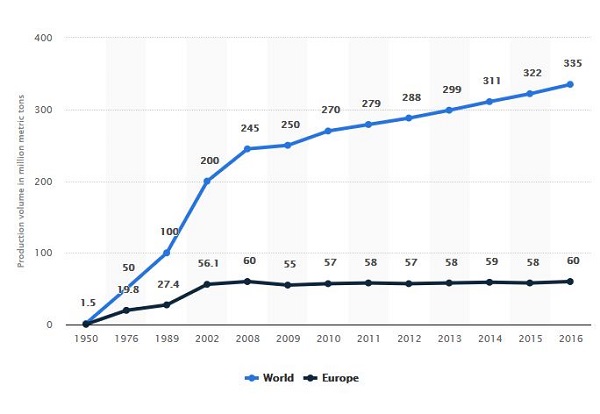 - the early 20th century, humanity has produced an estimated 8300 million tonnes of the stuff. Around three-quarters has been thrown away, and 80 per cent of that has drifted into the environment or gone into landfill. Eight million tonnes a year end up in the ocean – 5 trillion pieces and counting.