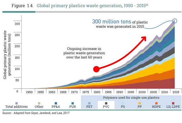 The UN report Single-use Plastics: A Roadmap for Sustainability tells us that if the growth in plastic production continues at its current rate, then by 2050 the plastics industry may account for 20 per cent of the world’s total oil consumption. Here’s the growth in the global plastic waste stream: