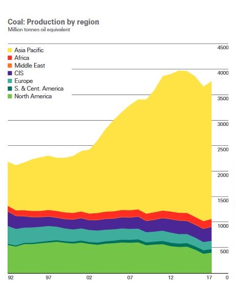 The graph sourced from a BP Statistical Review of World Energy shows peak coal in 2013, with production dropping year by year from there.