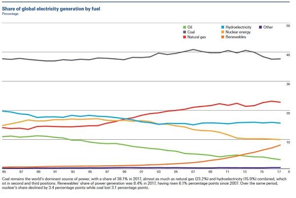 Coal remains the world’s dominant source of power, with a share of 38.1% in 2017, almost as much as natural gas (23.2%) and hydroelectricity (15.9%) combined, which sit in second and third positions. Renewables’ share of power generation was 8.4% in 2017, having risen 6.1% percentage points since 2007. Over the same period, nuclear’s share declined by 3.4 percentage points while coal lost 3.1 percentage points.