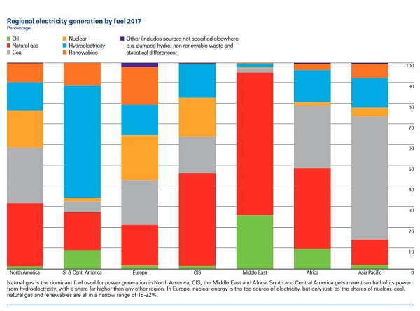 Natural gas is the dominant fuel used for power generation in North America, CIS, the Middle East and Africa. South and Central America gets more than half of its power from hydroelectricity, with a share far higher than any other region. In Europe, nuclear energy is the top source of electricity, but only just, as the shares of nuclear, coal, natural gas and renewables are all in a narrow range of 18-22%