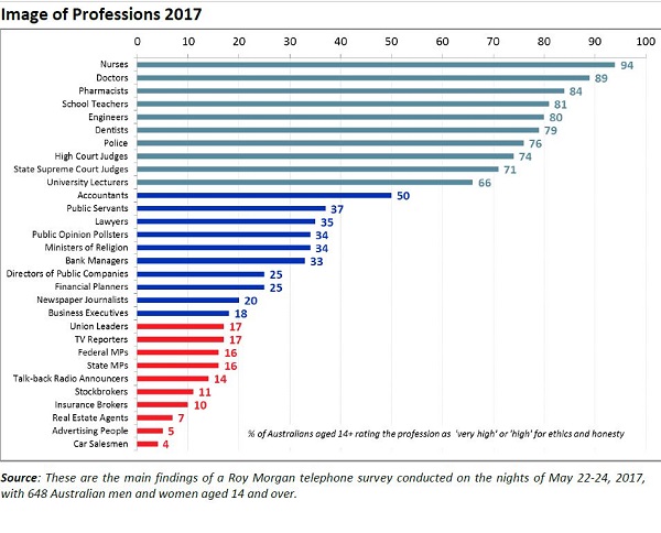 There you will find state and federal politicians on 16%, ahead of radio talk-back announcers on 14%, but behind TV reporters and union leaders on 17%, newspaper reporters on 20%. All of those are a far cry from nurses (97%) followed by doctors and pharmacists, then teachers (81%) pipping engineers (80%). High court judges are on 74%, behind dentists and police.