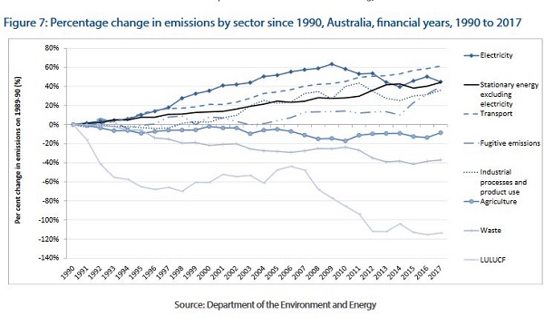 The big movers since 1990 are electricity, which increased by 51.9 Mt CO2-e, and LULUCF, where emissions have decreased by 114.9 per cent.