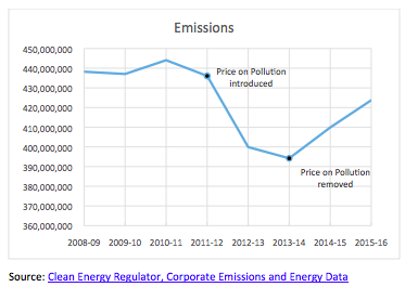 This graph from a March 2017 article featuring the infamous lump of coal in parliament incident, shows the effect of an actual climate policy instituted by the Gillard government, when a price was put upon carbon: