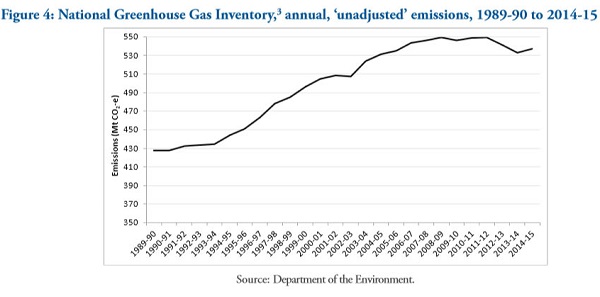 In the huge 368-page report we sent to the UNFCCC about our Paris commitments, in Section 2.1 (52 on the pdf counter) we told the UN authorities that excluding the LULUCF sector emissions had increased by 27.0% (113.4 Mt CO2-e) above 1990 levels.