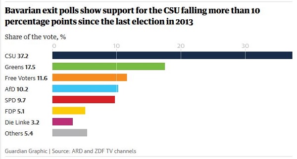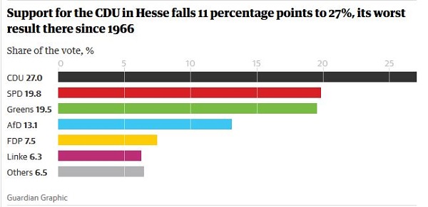 In October Merkel’s CSU had been humiliated in Bavaria, losing more than 10% of their vote to fall below 40% for the first time. However, the left centrist SPD did worse, becoming a minor party, supplanted by the Greens:
