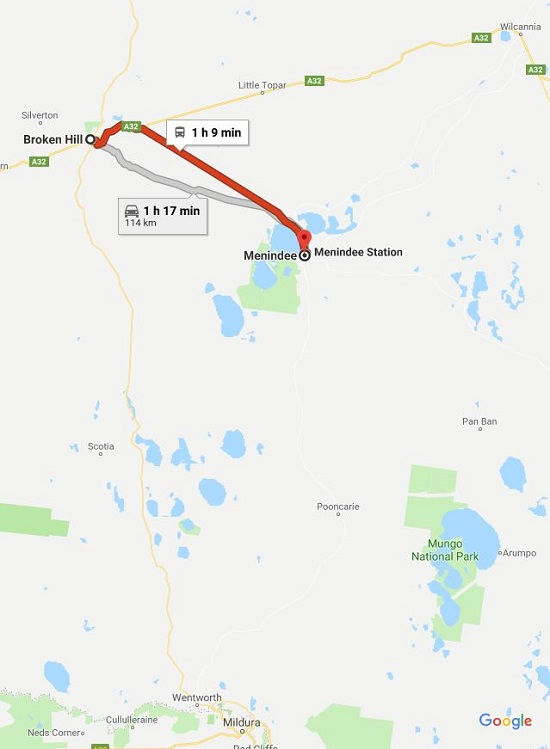 Menindie Lakes is about an hour’s drive south-east of Broken Hill. This screenshot helps place it: