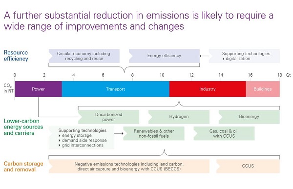 They regard this as difficult but achievable. It involves the complete decarbonisation of the electricity grid, more CCUS in conjunction with gas and coal, alternative fuels including bioenergy and hydrogen, further resource and energy efficiency including both increased use of circular economy techniques, and more use carbon removal techniques including direct air capture.