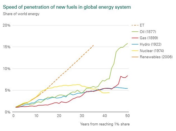 The report points out that the growth of renewables and speed of market penetration has been extraordinary. Here’s the speed of penetration in years after reaching the 1% foothold: