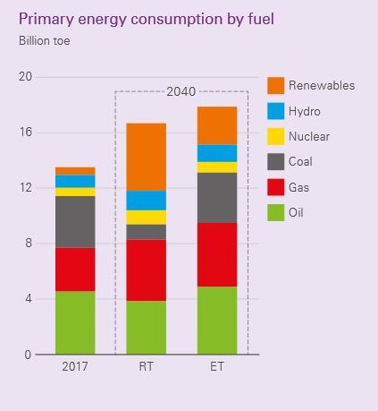 That is what BP thinks will happen on the basis of projecting forward what we are doing to date. However, in what they see as a Rapid Transition Scenario, BP still sees around half of our energy needs in 2040 coming from fossil fuels in the form of gas and oil. Here from the BP Energy Outlook, 2019 in a nutshell is the story: