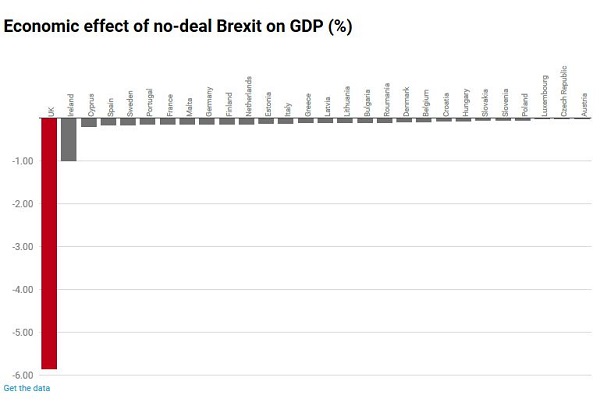 Their finding is that a no-deal Brexit will reduce the UK’s GDP by a staggering 5.8% of GDP. The worst hit would be Ireland, with a 2% reduction of GDP, then Cyprus with 0.2%.