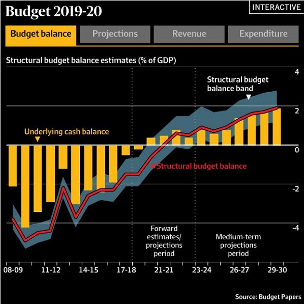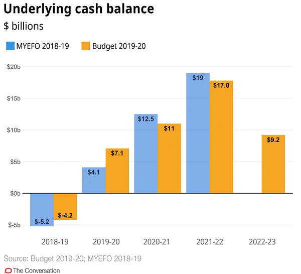 ScoMo and Josh Frydenberg have been telling us that the budget is “back in the black” and that people who work hard will be rewarded with substantial tax cuts, and that the nation’s budget debt, which has doubled under the LNP’s two terms, will disappear during the next decade like the morning mist. The surplus of $7 billion next year sounds like a large number until you match it with spending of $500.9 billion. Then it sounds like a rounding error. This makes it look large: