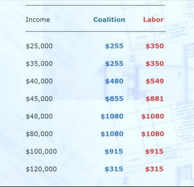 The surplus never reaches 1% of GDP which characterises a ‘fair dinkum’ surplus, around $20 billion in today’s dollars, before it dips in 2022-23 when the first tax cuts turn up. And here’s what the tax cuts look like (from How much you save under Labor and the Coalition’s tax plans at a glance: