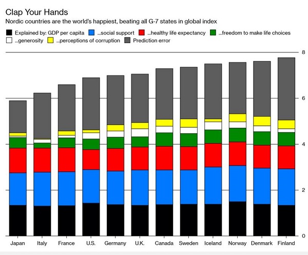 Obviously the Nordic model shines, as it does in the UN World Happiness Report, which seems more sophisticated, and is at least available (with Bloomberg full access is pay-walled):