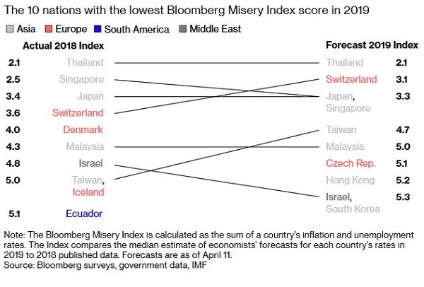 However, Thailand’s performance in the index is due to the Thai government’s unique way of tallying unemployment. More noteworthy are the performances of Switzerland, Japan and Singapore. For what it’s worth, here are the 10 least miserable: