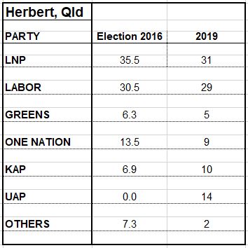 The thing about small parties in that they are strong in a relatively small number of seats, where their vote can be multiples higher than the national poll. One such is Herbert, based on Townsville. Here’s a single seat poll published in The Australian on 23 April 2019: