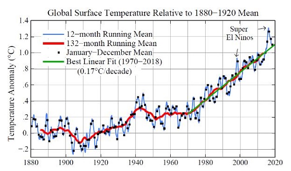 According to Hansen et al in 2018 global temperature was + 1.1°C (~2°F) warmer than in the 1880-1920 base period; we take that base period as an estimate of ‘pre-industrial’ temperature. Here’s the graph: