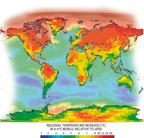 Remembering that land temperature warming is approximately double sea surface warming, and low latitude change will be perhaps three to five times greater than at the equator, this is one forecast of a world four degrees hotter than pre-industrial: