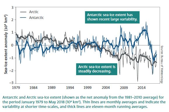 For example, Antarctic sea ice cover has plunged from 2014 levels after rising to that point, as shown in the State of the Climate report: