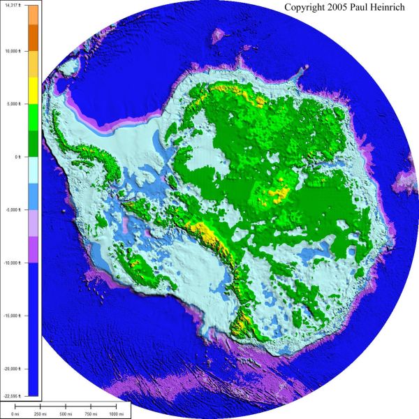 The blue and purple are below sea level. One could imagine the warm currents attacking the underside of the ice sheets for a very long time after CO2 levels are reduced. The heat is currently being forced into the ocean, but would leave in its own good time if we reduced CO2 concentrations.