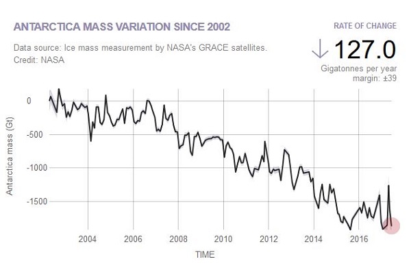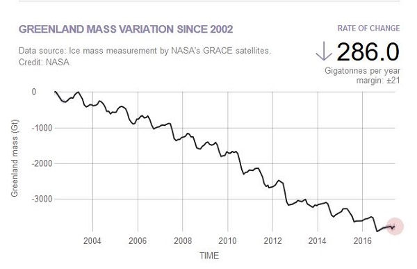 Stories such as Antarctic Sea Ice Declining ‘Precipitously’ Since 2014, Study Finds and Antarctica’s Ice Is Melting 5 Times Faster Than in the 90s are not what we want to hear. The last thing we need for a safe climate is ice sheets in play. Yet that is what we appear to have (from the NASA site). Greenland: