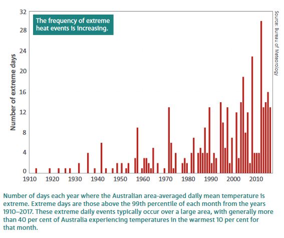 This step approach is important as to how we will experience climate change in the next century or so. We need to be mindful that significant risks can emerge from low-incidence, high-impact events, because there is much that we don’t know. The models give us smooth line projections, but we can be certain that the future will not conform to smooth curves. Also as responsible humans we need to take into account the longer term implications of our current actions now. As the surface temperature warms, other effects manifest themselves, such as from the CSIRO/BOM State of the Climate 2018 report, an increase in extreme heat events: