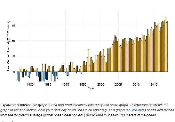 The second graph to watch is how energy is accumulating in the ocean. I don’t know of a constantly updated source, but this one shows what has happened in the upper 700 metres of the ocean in the last few decades, against a baseline of the average of 1955-2006: