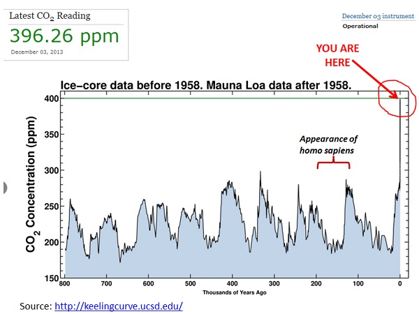 However, sea level tends to lag the other two. This graph, then, showing how CO2 has shot up compared to the last 800,000 years must be a worry: