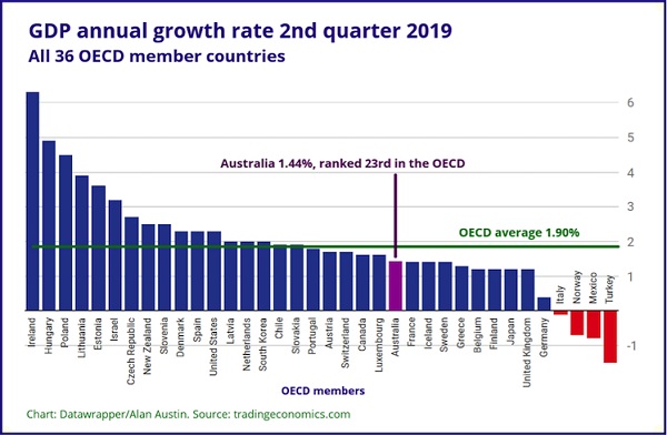 Many of the latest published outcomes are at historical lows and push Australia even further down the global rankings. The latest GDP figures released this week corroborate that Australia is in a serious rut, only saved by demand for minerals dug out of the ground and exported.