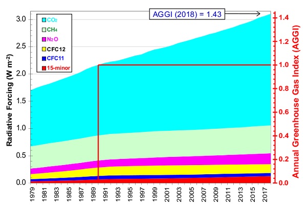 Forcing if 2018 was 1.43 times 1990 levels. The CO2e in 2018 was calculated as 496. I would question whether methane is adequately represented.