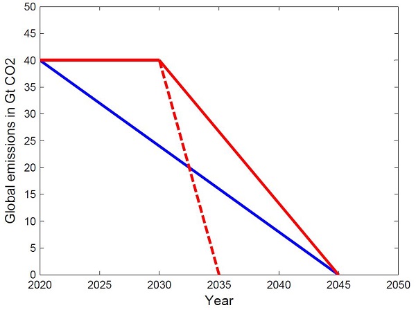 Stephen Rahmstorf’s recent article makes the point that delay in emissions reduction has a cost. Using a scenario where zero net emissions are to be achieved in 2045 from a peak in 2020. If we delay the start of emissions reduction to 2030 the target completion date needs to be brought forward to 2035: