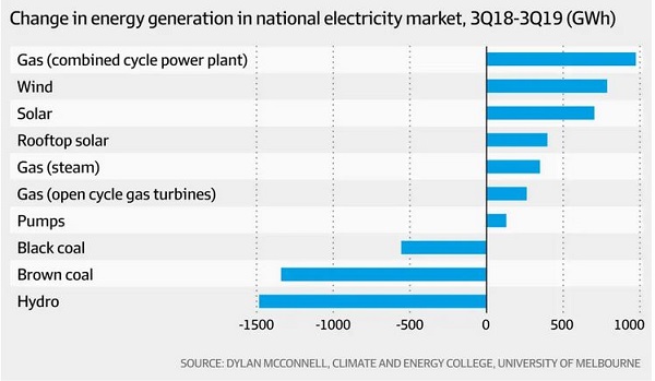 Hydro output has been lower because of the weather, but coal plants have been unreliable in NSW and Victoria, with increased solar, wind and gas making up the difference.