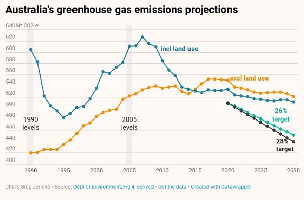 Australia has succeeded in reducing its standing on climate change action by refusing to increase its Paris commitments and brazenly using carry-over credits from the Kyoto Protocol. Greg Jericho did a hatchet job on this stunt in The Coalition isn’t being honest about the climate crisis. But neither is Labor*. He has an excellent graph on the Coalition’s record on emissions: