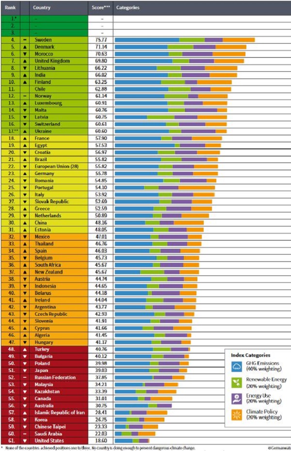 That was from the 2020 Climate Change Performance Index, prepared by a group of think tanks comprising the NewClimate Institute, the Climate Action Network and Germanwatch. They looked at national climate action across the weighted categories of emissions (40%), renewable energy (20%), energy use (20%) and policy (20%).