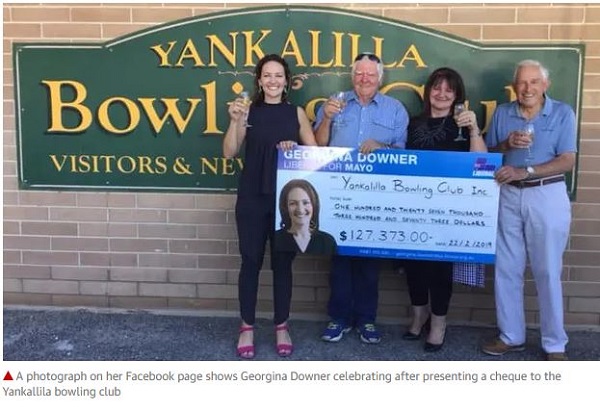 In February 2019 the same thing happened to Rebekha Sharkie when her Liberal opponent, Georgina Downer, got to hand over the big cheque to the Yankalilla bowling club featuring her face and Liberal party logos.