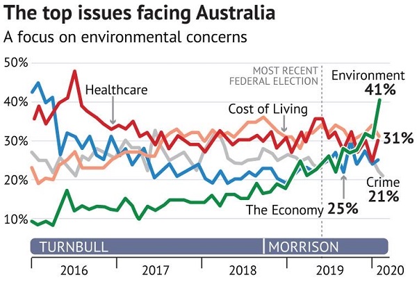 The environment has now catapulted to the top of the list of Australians’ biggest worries, leapfrogging cost of living, healthcare and the economy, writes Jessica Irvine in the SMH: