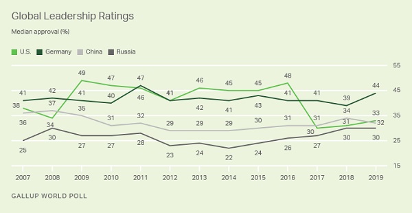 In this poll it seems over 40 is a top mark, and down around 30 is rubbish. Under Obama’s second term the US did well, but Trump saw the US slump from 48 to 30. You can see how much Putin and Xi have impressed.