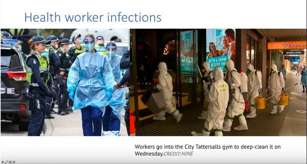 MacIntyre points out also that we are simply not up to speed in using masks as a frontline tool for the public, or in our health system. On occupational PPE she posts this image, which contrasts health workers with cleaners about to disinfect a gym where there was one infected case:
