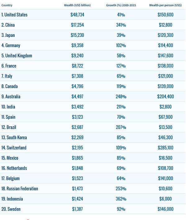Wealth specialists New World Wealth have charted the wealth held by individuals in countries to rank the top 20: