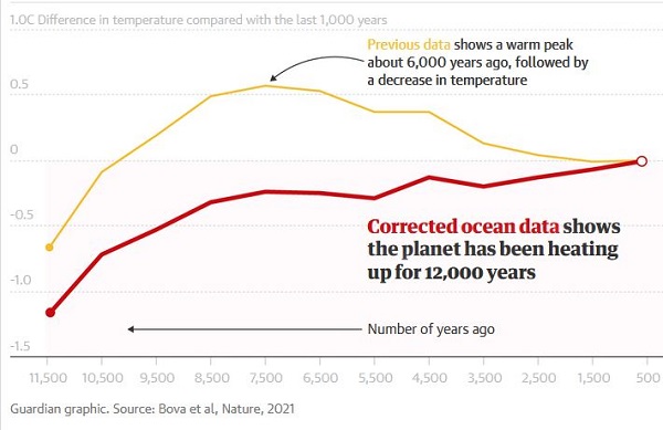 The thermal maximum thought to have existed 10 to 6,000 years ago, disappears in favour of steady warming.