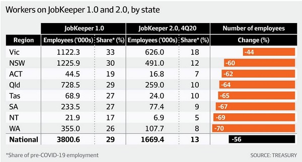 - New Tax Office figures showed 1.54 million workers remained on JobKeeper at the end of 2020 – down from 3.6 million in September 2020 – while about 520,000 companies have stopped receiving the payments as their trade recovers.