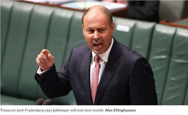 The Morrison Government generally won plaudits for JobKeeper, deserved if you overlook the fact that at least 2.1 million people missed out. Now Josh Morrison says JobKeeper will not be required after March 31. Here he is saying it: