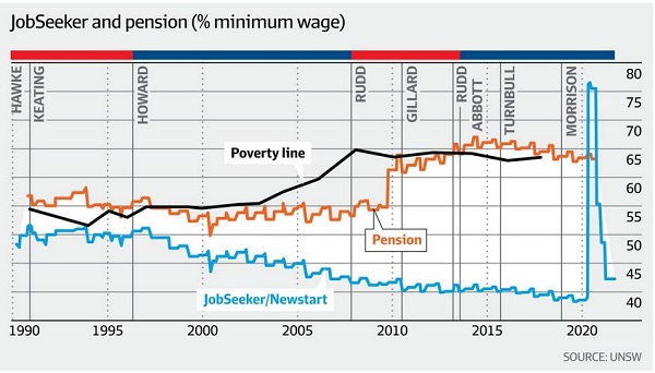When the Howard government came into power in 1996, Newstart was worth 20.6% of the average male full-time weekly earnings; by the end of 2007 it was down to 17.5%; now it is 14.9%.