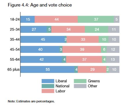The Coalition gets in front with the 50-64 group, and more so with 65+. Old Greens are rare with only 3%.