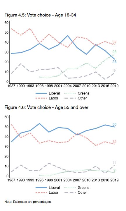 Young voters (18-34) were 27/43/22 for Coalition/Labor/Greens. Please note Labor is way ahead of the Greens.
