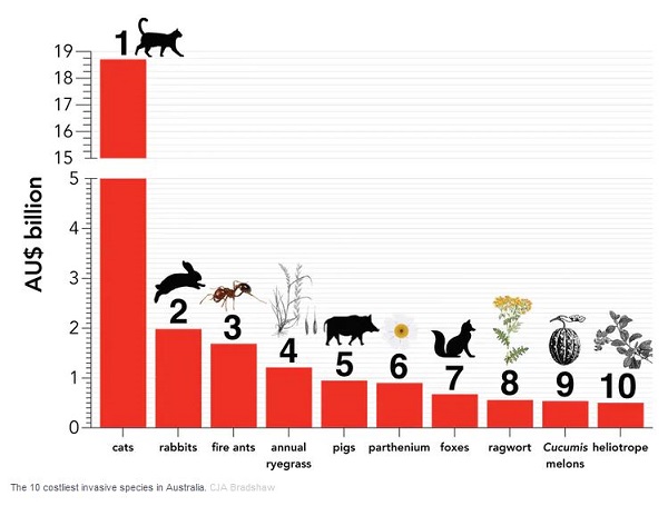 Our paper – the most detailed assessment of its type ever published in this country – also reveals feral cats are the worst invasive species in terms of total costs, followed by rabbits and fire ants.